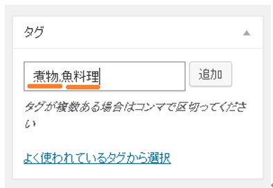 複数のタグを設定したいときには、この画像のようにコンマ区切りで入力します。