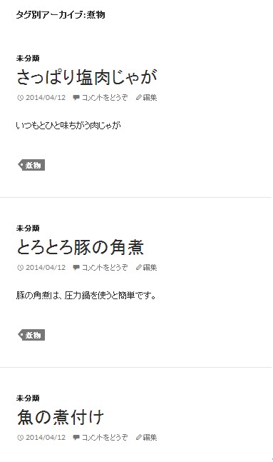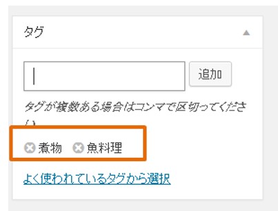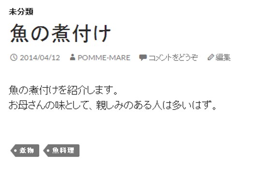 まずは記事での表示です。WordPressのテーマによって表示箇所は異なりますが、記事の最後などにタグの一覧が表示されます。(この画像では「煮物」「魚料理」がタグ)