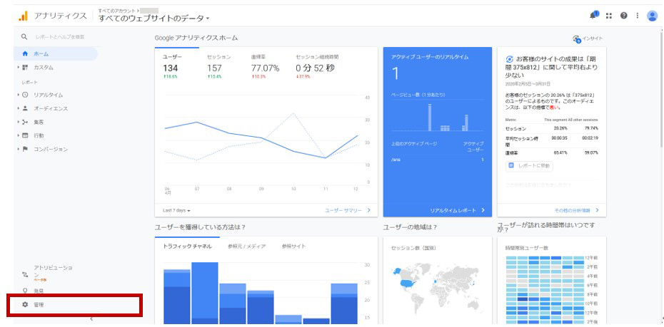 設置した次の日に「アナリティクスのすべてのウェブサイトのデータ▼画面」(管理画面)に入って、『Google アナリティクス ホーム』のすぐ下の棒線グラフが右上がりだったら設置がちゃんとなっている証拠。