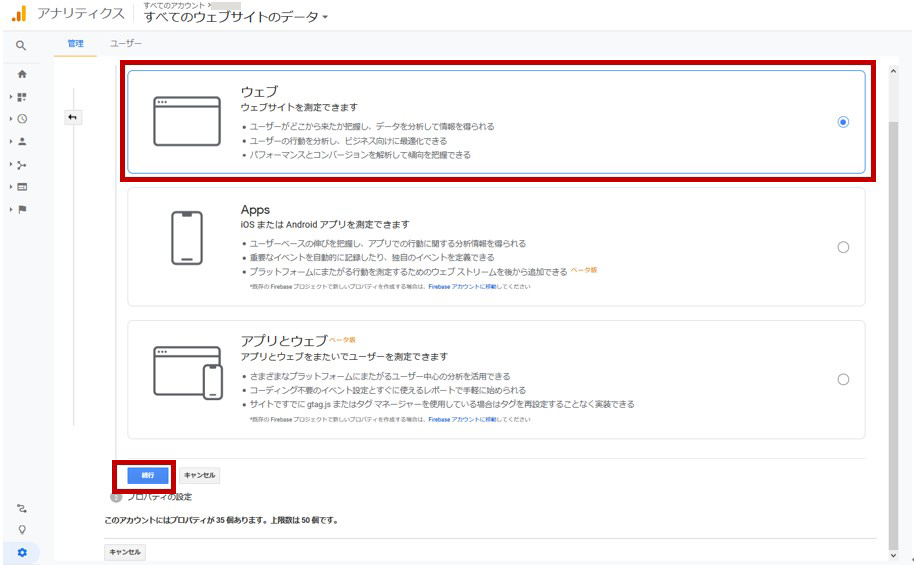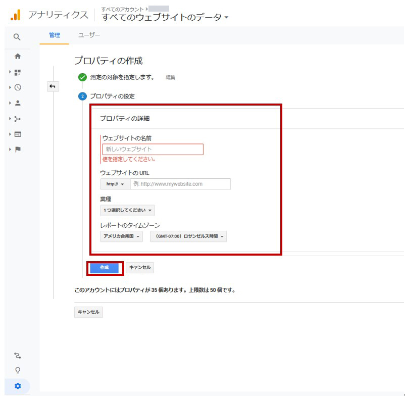⑧ウェブサイトの名前 、ウェブサイトの URL 、業種、レポートのタイムゾーンを入力出来たら、『作成』ボタンをクリック