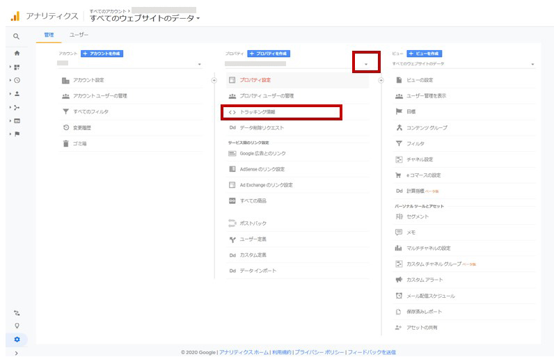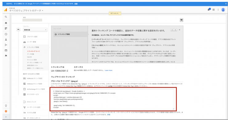 ※トラッキングコードをもう一度確認したい場合は「アナリティクスのすべてのウェブサイトのデータ▼画面」→「管理」→「プロパティの企業を選択して」→トラッキング情報の「トラッキングコード」をクリックすると表示されます。