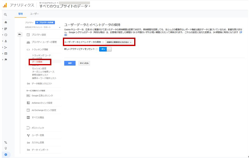⑫『データ保持』→ユーザーデータとイベントデータの保持26ヶ月を『自動的に期限切れにならない』に変更し『保存』